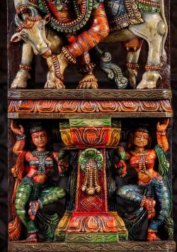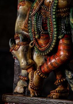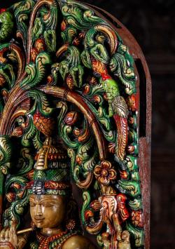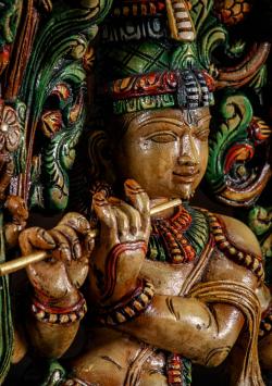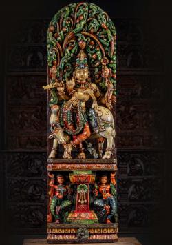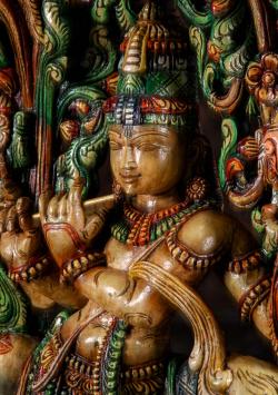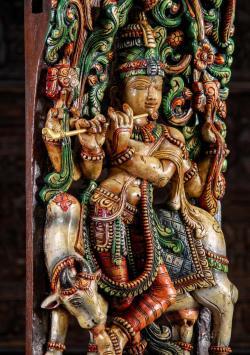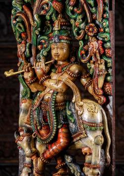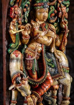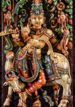 Krishna is the eighth incarnation or avatar of Lord Vishnu. Krishna is famous for playing the flute. His flute playing would beguile the cow herder's daughters whom were all in love with Krishna. Krishna, besides being a hero and central figure of Bhagavad-Gita, was seen as an affirmation of life. He loved life and lived his time on this earth to the fullest. There is a cow behind him licking the underside of his foot